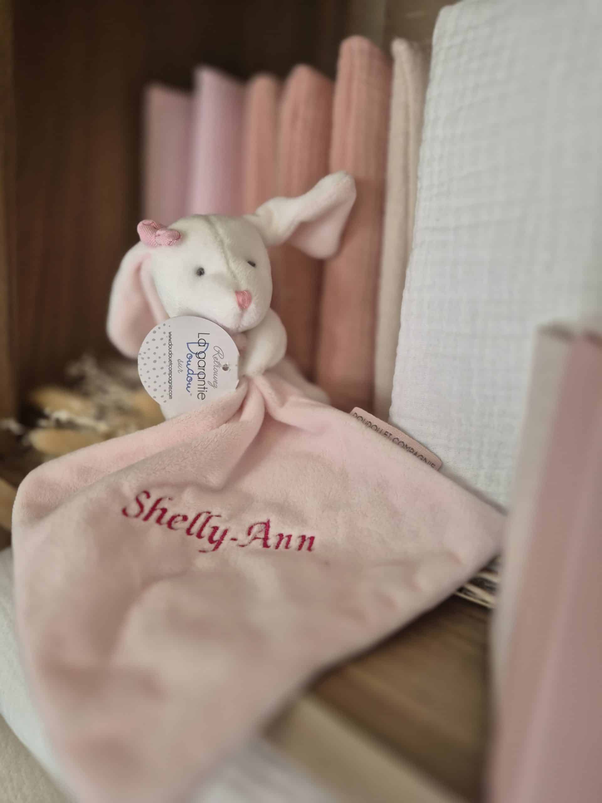 Ce doudou comme tout ses copains est personnalisable avec le prénom de votre choix en broderie
